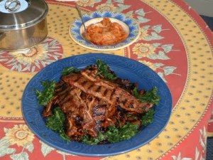 Mom and Dad both cooked. It wasn’t haut cuisine, but it was pretty healthy and had variety. I was born in 1949 so my earliest days in memory are in the fifties, not a heyday for American cookery. We had our share of frozen potpies and TV dinners and Mrs. Paul’s fish-sticks, but more often it was a home-cooked meal. My mother was a Midwesterner, so it was pretty simple with not a lot of seasoning. But she did have a well-worn copy of M.F.K. Fisher’s “How to Cook a Wolf” on her shelf, which was pretty avant-garde in those days. Fisher, Elizabeth David, and, of course, the incomparable Julia Child, were bringing back dispatches from the front about such exotica as olive oil and fresh garlic.