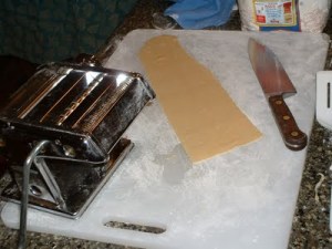 I have made this pasta several ways: with just a rolling pin and a sharp chef’s knife, with the pasta extruder on my Kitchen-Aid mixer, and with a stainless steel hand-cranked pasta machine. I like the latter best myself. I bought mine at the First Church tag sale many years ago, and it has made a lot of pasta at the Floyd household.