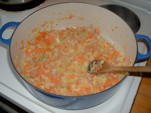 Heat oil and butter in a large heavy-bottomed skillet or casserole, and when the butter foams add the pancetta, onion, carrot and celery and sauté over medium high heat until it takes on some color and is beginning to brown.