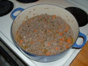 Turn the heat down to medium and add the beef. Cook, breaking up the pieces and stirring, until the pink goes out of the beef, but don’t brown it. Add the white wine, turn the heat back up a bit, and let all the wine evaporate, stirring now and again. Turn the heat back down to medium and add the milk and nutmeg, and cook until the milk evaporates, stirring from time to time.