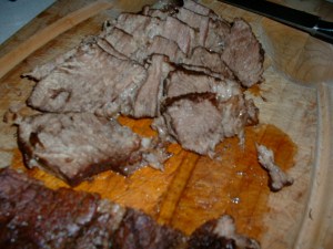 After two and one half hours, check the meat. It should be nice and tender but still firm enough to cut. Put it on a platter, tent it with foil, and let it sit for fifteen minutes. While the meat is cooling, put your braising liquid on the range top and simmer it to reduce the sauce a bit, stirring now and again. Remove the parsley sprigs, taste and season for salt and pepper.